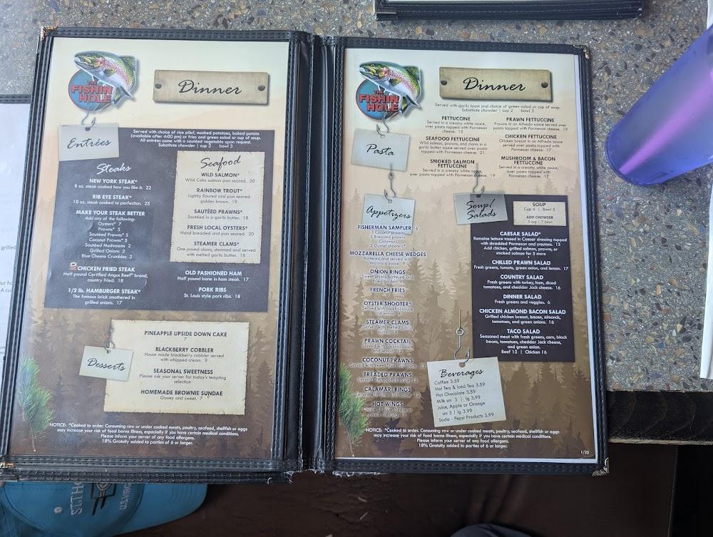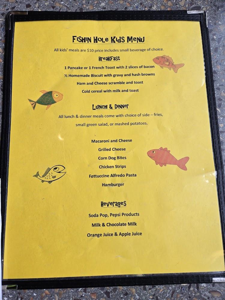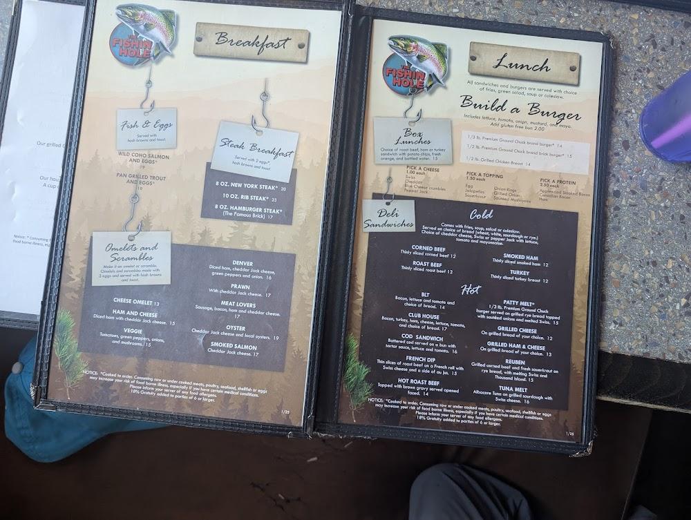 Fishin Hole's menu showcases a broad range of classic American dishes. Start your day with various breakfast options, including omelets, pancakes, or hearty breakfast platters. Lunch and dinner offer an array of sandwiches, burgers, and seafood dishes.